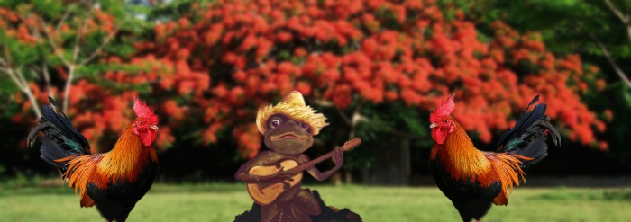 Y el coquí, asustado, entre las rocas mojadas, furioso grita al gallo: “¡Calla gallo, presumido! así ya no puedo dormir! ¡Vete lejos de estos lares! Yo canté toda la noche, como coquí, borincano; Oye gallo, engreído, el sueño, me vas quitando.”